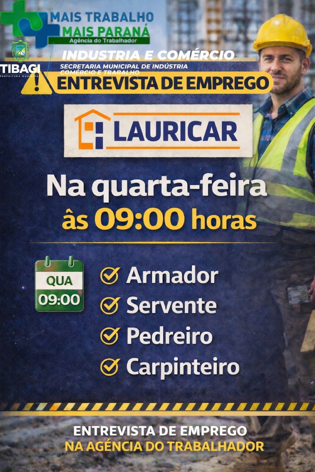 A Agência do Trabalhador de Tibagi promove, na próxima quarta-feira, um mutirão de entrevistas de emprego em parceria com a empresa Lauricar. A ação acontece a partir das 9h, na própria Agência, e é voltada ao preenchimento de vagas na área da construção civil.