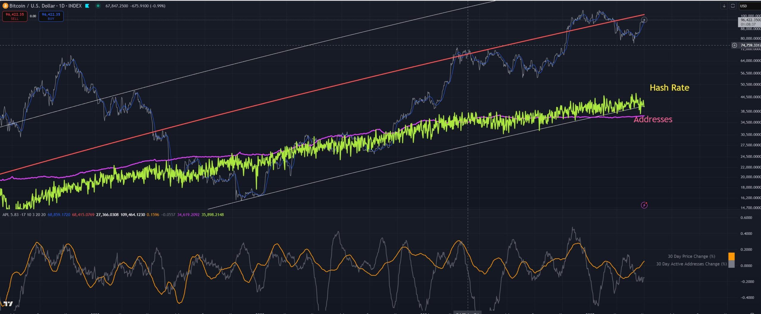 Ecoando a perspectiva de Breedlove22, outro usuário do X compartilhou que a avaliação do BTC com base na taxa de hash está em um nível de suporte, sugerindo que um fundo local pode ter sido alcançado.