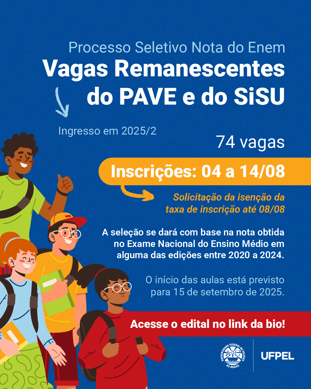 card enem vagas remanescentes 2025 2 minQuem participou do Exame Nacional do Ensino Médio (Enem) em 2020, 2021, 2022, 2023 ou 2024, pontuou na prova de redação e concluiu a respectiva formação escolar poderá se inscrever, via Internet, de 4 a 14 de agosto, no processo seletivo simplificado da Universidade Federal de Pelotas (UFPel). A oferta, com 74 vagas, abrange os cursos de Agronomia, Meteorologia, Pedagogia e Química Forense.