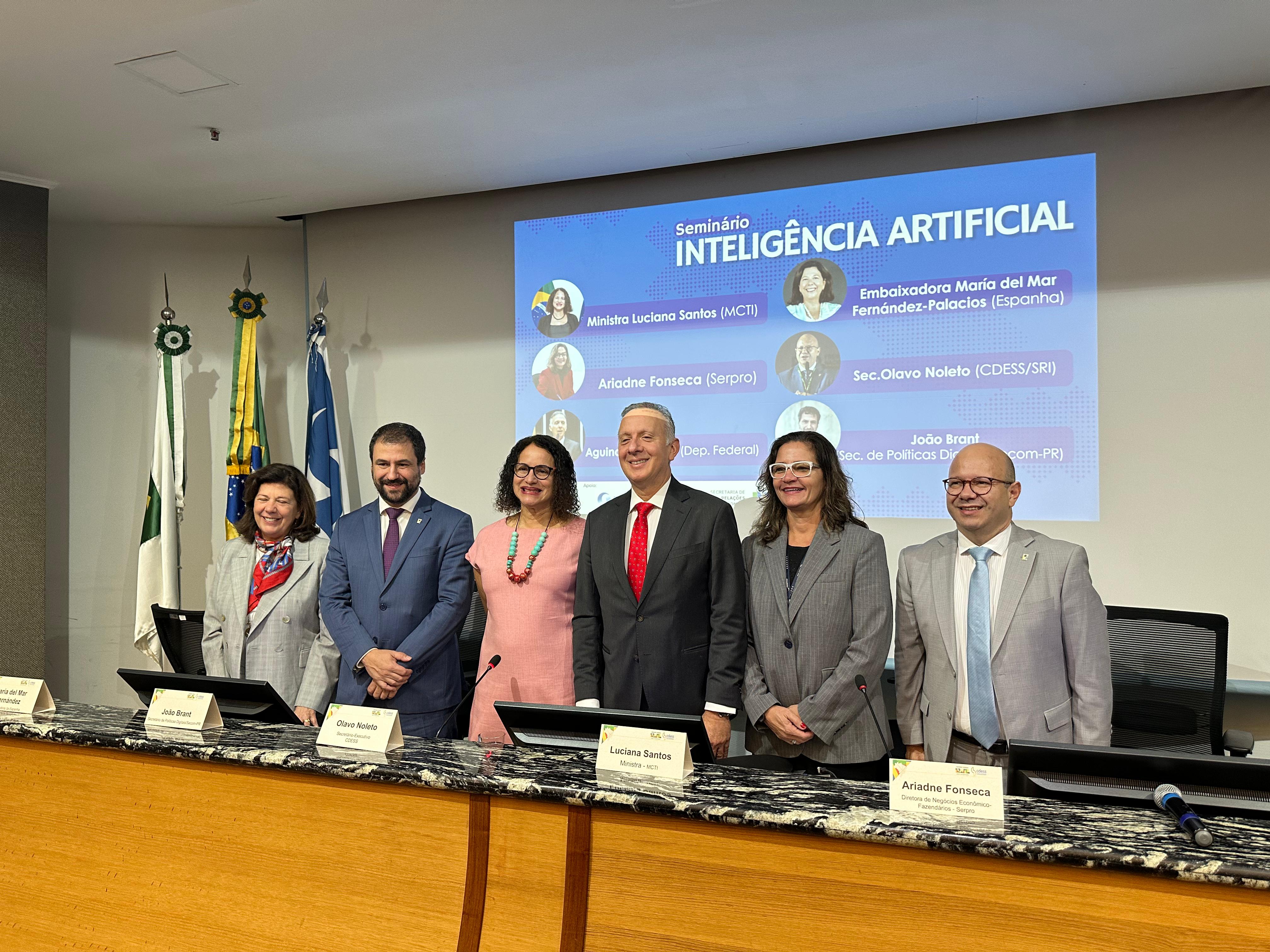 O Conselho de Desenvolvimento Econômico Social Sustentável – CDESS, o Conselhão, promoveu nesta quarta (11) pela manhã o Seminário Inteligência Artificial, na sede do SERPRO, em Brasília-DF. O secretário-executivo do Conselhão, Olavo Noleto, foi acompanhado pela ministra Luciana Santos (MCTI), pelo deputado federal Aguinaldo Ribeiro, por Mar Fernández-Palácios (Embaixadora da Espanha), o secretário João Brandt (SECOM) e a diretora do SERPRO, Ariadne Fonseca.