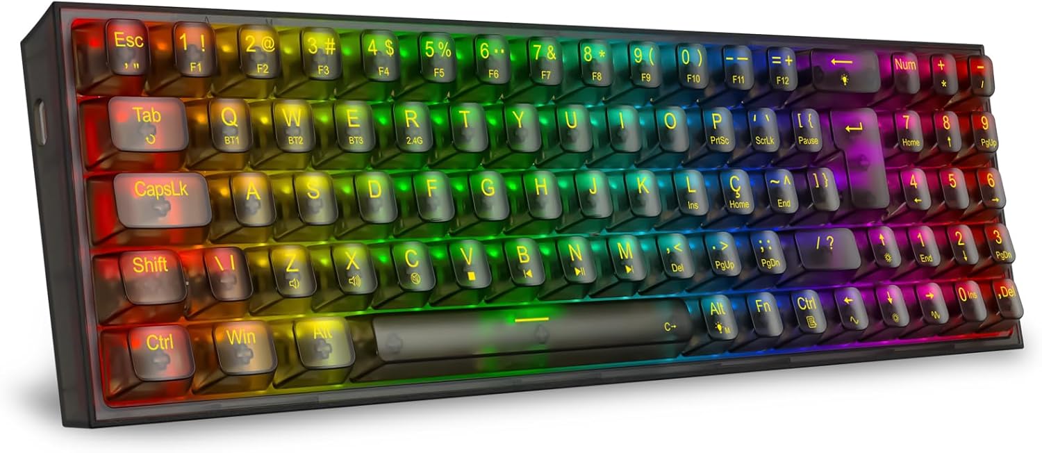Características: – Teclado no formato de 78 teclas – Formato compacto com numérico integrado – Iluminação RGB Redragon Chroma Mk.II individual – Keycaps Translúcidas pretas para criar um efeito diferenciado com a iluminação – Layout ABNT2 feito especialmente para o mercado brasileiro – Hotswap Pro para maior compatibilidade com diferentes switchs Especificações: Switches: Redragon Brown Acionamento: Mecânico Hot Swap Pro compatível com switchs 5 pinos Formato: 78 teclas Layout: ABNT2 Conectividade: USB, Wireless (através do dongle que acompanha o produto) ou Bluetooth Software: Não Ajuste de altura: Sim Iluminação: RGB Redragon Chroma Mk.II Rollover: N-Key Rollover Cabo USB removível: Sim, com conexão USB-C Comprimento do cabo: 1.5m aproximadamente Keycaps: ABS Doubleshot Bateria: 1600mAh Peso Bruto(g): 910 Peso Líquido(g): 810 Dimensões da embalagem. 390mm(L) X 150mm(P) X 60mm(A)