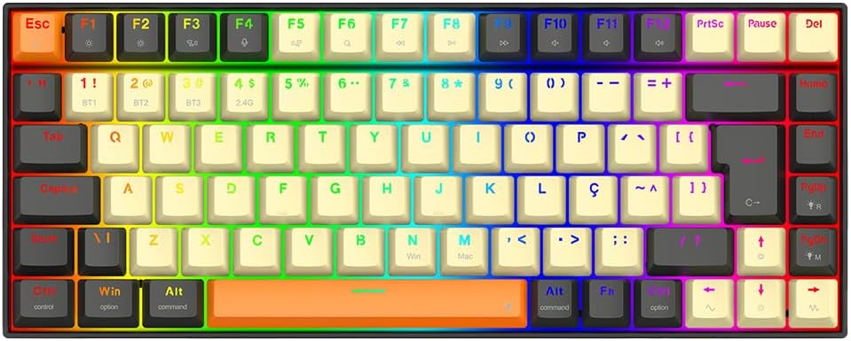 Características: – Teclado no formato 75% – Conjunto de keycaps extras – Iluminação RGB Redragon Chroma Mk.II individual – Keycaps double shot injection de qualidade superior para maior longevidade – Layout ABNT2 feito especialmente para o mercado brasileiro – Foam mod a PCB e plate do teclado e também na base do teclado – Hotswap Pro para maior compatibilidade com diferentes switchs Especificações: Switches: Redragon Brown Acionamento: Mecânico Hot Swap Pro Formato: 75% Layout: ABNT2 Conectividade: USB, Wireless (através do dongle que acompanha o produto) ou Bluetooth Software: Não Ajuste de altura: Sim Iluminação: RGB Redragon Chroma Mk.II Rollover: N-Key Rollover Comprimento do cabo: 1.5m aproximadamente Keycaps: ABS Doubleshot Bateria: 1600mAh Peso Bruto(g): 1244 Peso Líquido(g): 1165 Dimensões da embalagem. 350mm(L) X 170mm(P) X 70mm(A)